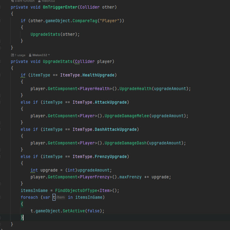 Since this was a roguelike game we wanted items that would boost your stats during that run but wouldn't carry over to the next run. Upgrades that we managed to make was increasing your damage, your maximum health as well as increasing your maximum "frenzy" (which is an ability bar basically) The item dropping stat upgrades was unfortunately cancelled however we used these items in the shop.